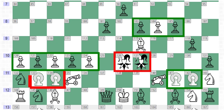 One type of random event may affect pieces on certain squares (for instance pieces on squares 48 and 49 are killed and removed from the board).