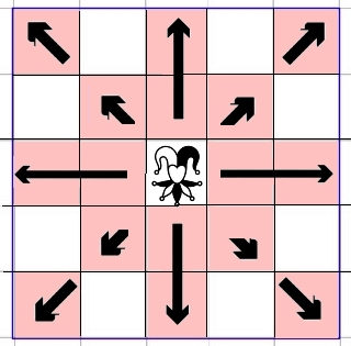Jesters are like a mini queen or a strong king: they can move and take in all axes, but only up to two squares.